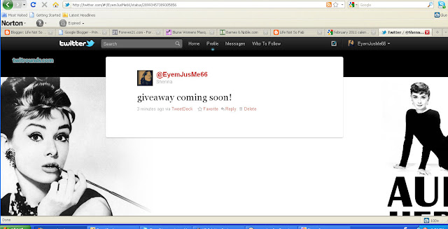3. Tweet the following message on Twitter: "I just entered #TheMoreTheMerrier giveaway on @eyemjusme66 blog lifenotsofab.com and you can too! http://bit.ly/g63Zyl". Once you have done this in a separate comment below, give me the link to the message along with your name and email address. You can find the link to your Twitter messages by logging into the Twitter website and clicking on the time-stamp. This is another extra way to enter, but remember no matter which way you enter you MUST be a follower of my blog or it will not count.